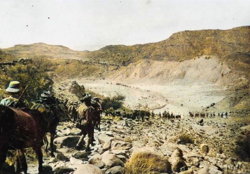 Part of the British force returning from the conflict, passing through the hills at the southern border of Marri country. The Marri Punitive Expedition (1918) was a British military campaign in Balochistan, India against the Marri and Khetran tribes, resulting in significant tribal defeats and economic damage.