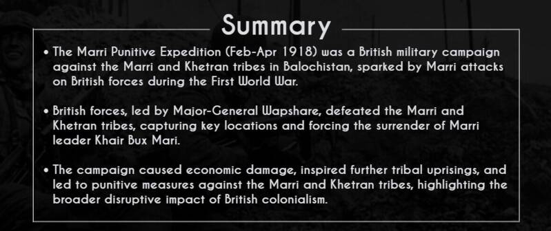The operations against the Marri and Khetran tribes, known as the Marri Punitive Expedition, highlight the impact of British colonialism on the wider political landscape.