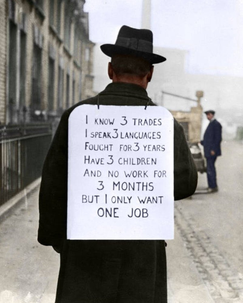 An unemployed man holds a sign voicing his frustrations. Circa early 1930s.