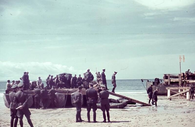 A landing exercise wWith the "Führerweisung" No. 16 of 16. In July 1940, the Wehrmacht began intensive preparations for the company "Sea lion". On the sandy beaches of Sylt or the French Channel Coast (picture), German soldiers rehearsed the invasion of England. In this case, a landing raft consisting of several boats served as a floating transport for the field hit. On 16 July 1940, Hitler issued Directive 16, formally authorising preparations for Operation Seelöwe, the planned German invasion of Britain. The directive outlined a cross-Channel assault designed to secure a decisive victory, contingent upon achieving air and naval superiority. Responsibility fell upon the Kriegsmarine and Luftwaffe to neutralise the Royal Navy and cripple Fighter Command. While meticulous in its ambition, the directive underestimated Britain’s resilience and the logistical complexities of an amphibious invasion, leaving Seelöwe fatally compromised from inception.
