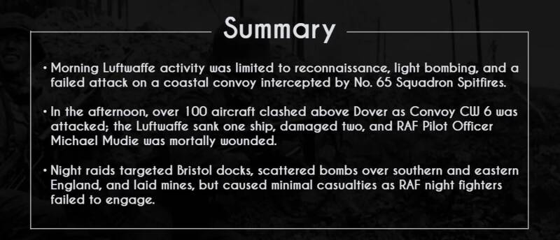 Convoys in the Thames Estuary and off Harwich were struck by Bf 110s, Do 17s, and Ju 87s. RAF Hurricanes and Spitfires intercepted, downing several enemy aircraft but losing multiple fighters and crews in the process.