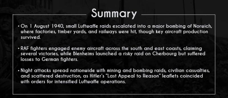 By evening, Bf 110 fighter-bombers of Erprobungsgruppe 210 attempted a strike on Norwich, though damage was slight.