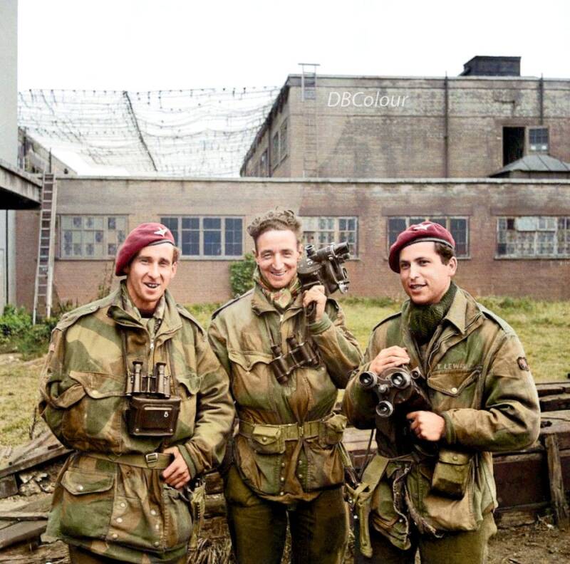 The three Army Film and Photographic Unit Photographers who took the graphic still and cine pictures of the 1st Airborne Division at Arnhem. The photo, which shows them with their cameras, was taken at the AFPU Centre at Pinewood Studios, Iver Heath, Buckinghamshire on 28 September 1944, the day that they arrived back. Smith was wounded in the shoulder. Left to right: Sgt. Dennis M Smith, Sgt. Gordon "Jock" Walker and Sgt. C M "Mike" Lewis.
