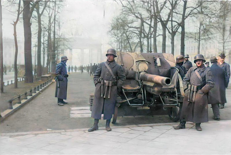 Germans stand guard with an armored car in front of the Chancellor’s Palace in Berlin during the German Revolution 13th May, 1919. The German Revolution marked a tumultuous period of political upheaval and social unrest following World War I. Sparked by discontent with the monarchy's handling of the war and exacerbated by economic hardship, it culminated in the abdication of Kaiser Wilhelm II and the establishment of the Weimar Republic.