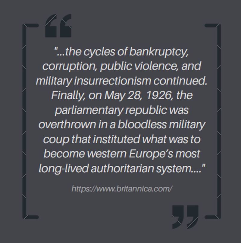 Gomes da Costa on the balcony of the Coimbra Civil Government, acclaimed by people, June 1926. The 28 May 1926 coup in Portugal, known as the May 28 Revolution, led by General Gomes da Costa, overthrew the democratic First Portuguese Republic, paving the way for a military dictatorship. da Cosat did not last long in power, being himself removed by another coup, to be replaced by Óscar Carmona a month later.