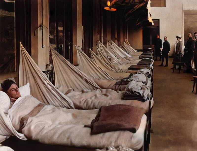 A German prisoner and a wounded British soldier lighting cigarettes at an advanced dressing station. Epehy, France, 1918. Colorised by Julius Colorization.
