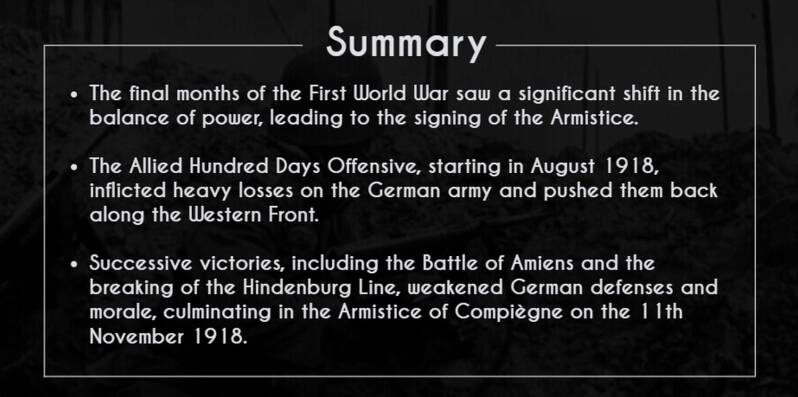 In the final months of the First World War, the tide of the conflict shifted dramatically, marking the beginning of the end for the Central Powers and ultimately leading to the signing of the Armistice.