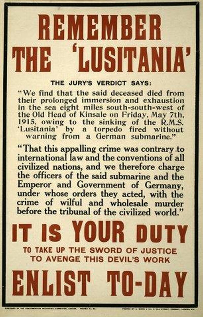 The RMS Lusitania: The sinking of the Lusitania on the 7th May 1915, by German U-boat U-20 killed nearly 1,200 people, including 128 Americans. This atrocity outraged the U.S. public, escalating anti-German sentiment and fueling tensions between the U.S. and Germany. The tragedy contributed to increased scrutiny of the National German-American Alliance, already viewed with suspicion for its ties to Germany. By 1918, growing anti-German hysteria and accusations of disloyalty led to the Alliance's dissolution amid declining public support.