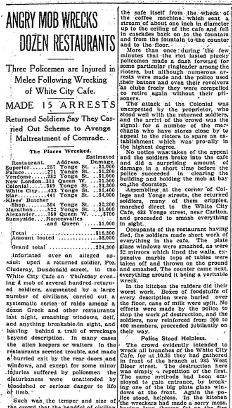 Crowds of 5,000–20,000 people, led by military veterans, looted and destroyed Greek-owned businesses in downtown Toronto, forcing police to invoke the Riot Act and call in militia forces.