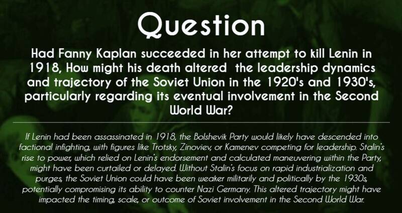 Vladimir Lenin: The assassination attempt on Lenin in 1918 by Fanny Kaplan stemmed from her opposition to Bolshevik policies, particularly the dissolution of the Constituent Assembly and the Treaty of Brest-Litovsk, which angered Socialist Revolutionaries.