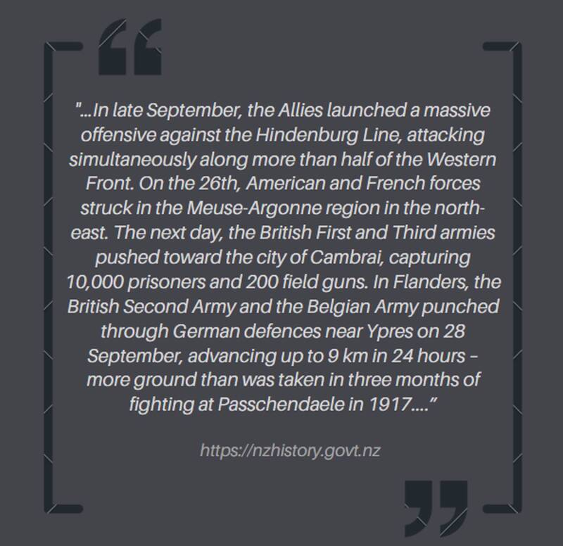 1918: spring offensive and advance to victory, URL: https://nzhistory.govt.nz/war/western-front-1918, (Manatū Taonga — Ministry for Culture and Heritage), updated 28-May-2024