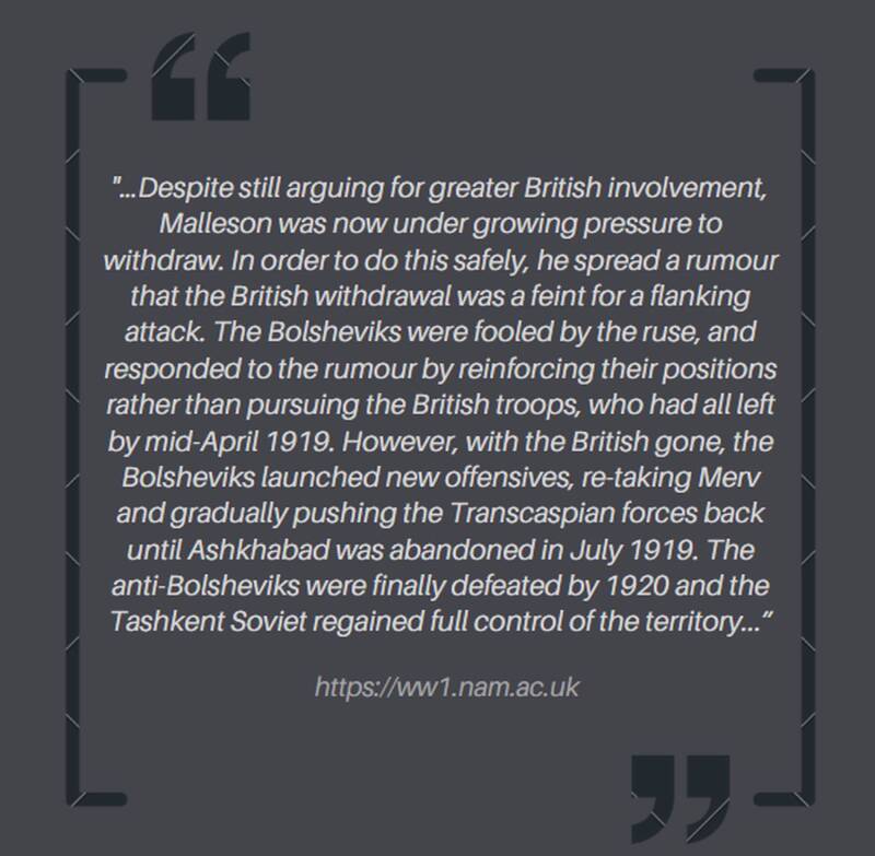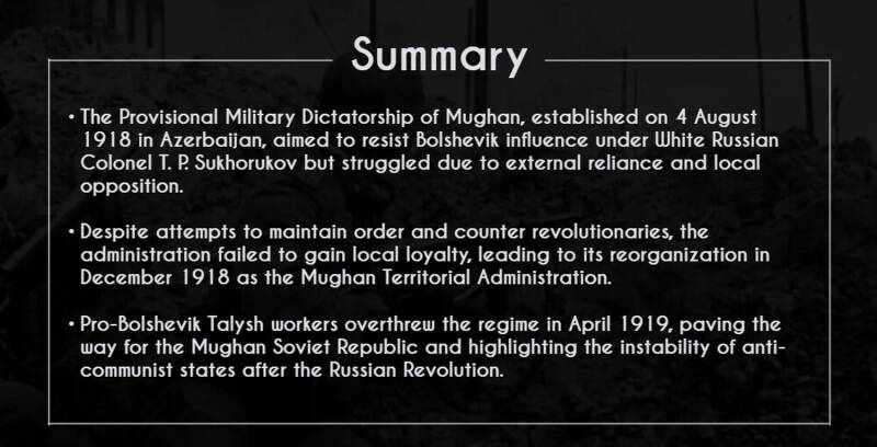 Supported by British forces occupying nearby Baku, the Mughan government was led by White Russian Colonel T. P. Sukhorukov, who opposed Bolshevik influence and sought to maintain the region as an autonomous part of a "single and indivisible Russia."