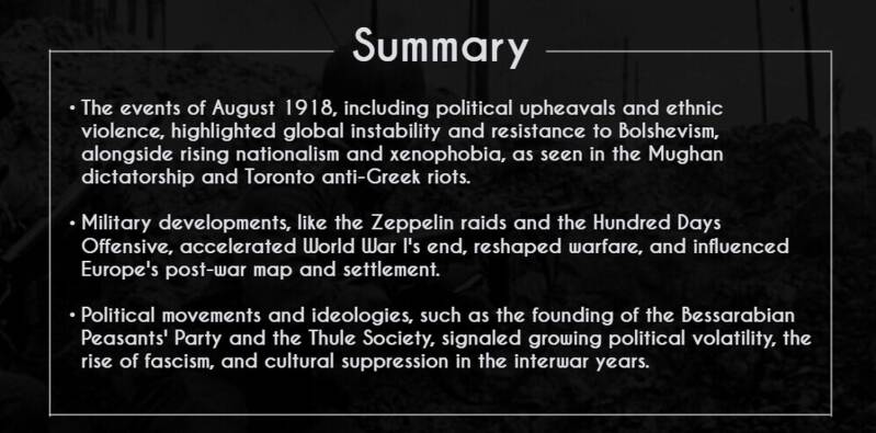 The events of August 1918, from political upheaval to violent ethnic strife, had profound implications for Europe and the world during the 1920s and 1930s, reflecting the global turbulence of the time.