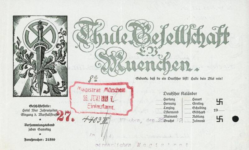 A Thule Society Lapel Badge. In the 1920s and 1930s, the Thule Society influenced Nazi ideology through its emphasis on Aryan racial purity, antisemitism, and mysticism, shaping key figures like Heinrich Himmler and promoting Nazi nationalism.