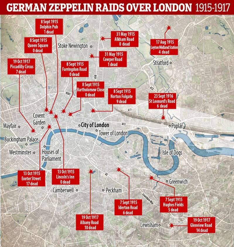 This map shows the locations and dates of all the bombing raids on London by Zeppelins during the First World War. The Zeppelin raids on London during World War I caused extensive damage to buildings, homes, and infrastructure. Bombs destroyed entire streets, killing and injuring civilians. Iconic landmarks were threatened, and fires frequently broke out. The attacks disrupted daily life, left thousands homeless, and highlighted the vulnerability of urban centers to aerial bombardment.