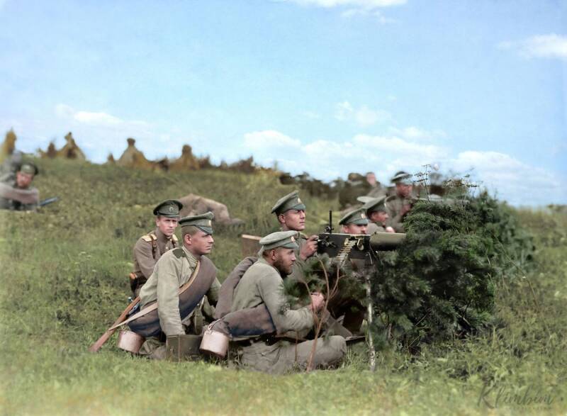 Russian Empire, military exercises: Machine gun position, 1914. Four years later, the Treaty of Brest-Litovsk would facilitate Russia's exit from the First World War.