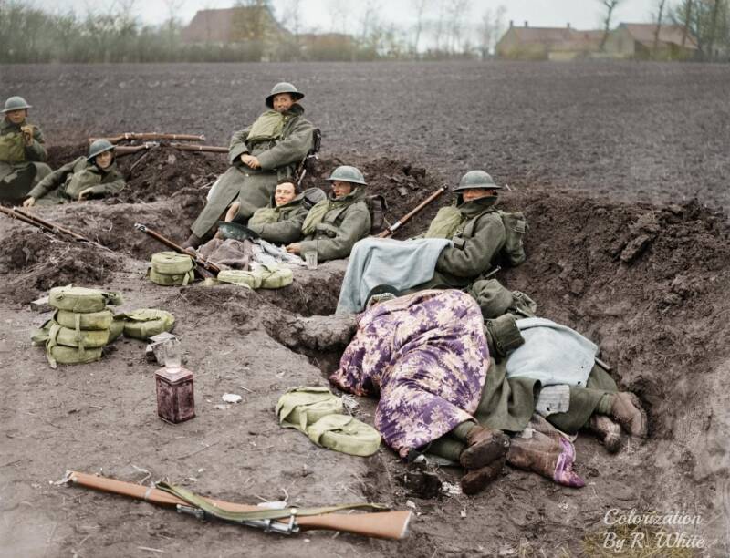 British soldiers of the 51st Division resting in a hastily dug trench in a ploughed field near Locon during the German spring offensive, 10 April 1918. The German Spring Offensive initially caused significant disruption and heavy casualties among Allied troops, forcing rapid retreats and creating panic, but ultimately led to a more unified and resilient Allied response, bolstered by reinforcements.