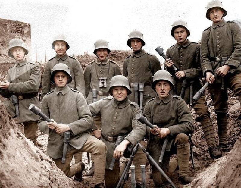 German Stormtroopers posing for a photograph with hand-grenades, March 1918. German stormtroopers during the 1918 Spring Offensive were elite units trained for rapid, deep infiltration behind enemy lines. They employed surprise, speed, and targeted attacks to bypass strongpoints, creating chaos and enabling initial German advances, though ultimately unsustainable.