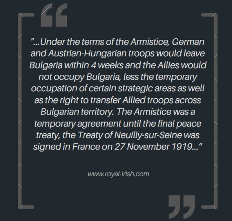 The terms of the armistice were harsh for Bulgaria, as they had to agree to the demobilization of their army, the occupation of strategic territories, and the surrender of military equipment to the Allies.
