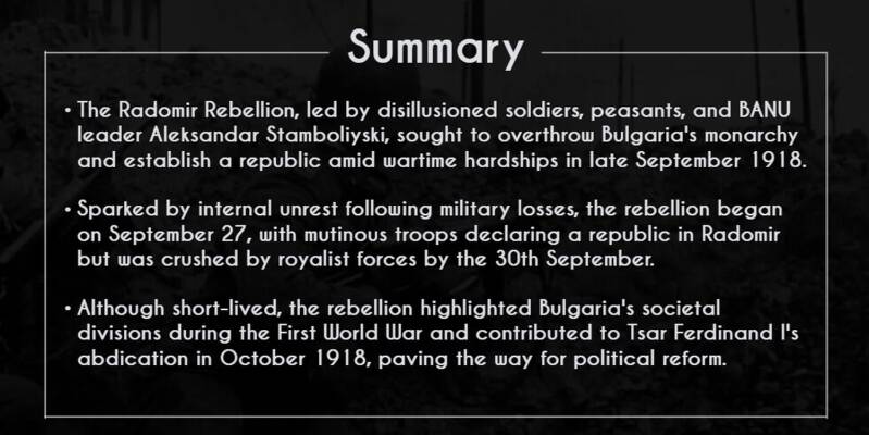 The Radomir Rebellion reflected the deep societal divisions and discontent that characterized Bulgaria during the war.