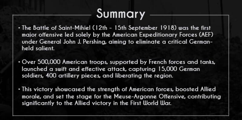 The Battle of Saint-Mihiel (12th - 15th September 1918) was the first major independent U.S. offensive in the First World War, led by General John J. Pershing. American and French forces successfully attacked German positions in northeastern France, capturing strategic territory and weakening German defenses, demonstrating U.S. military strength on the Western Front.