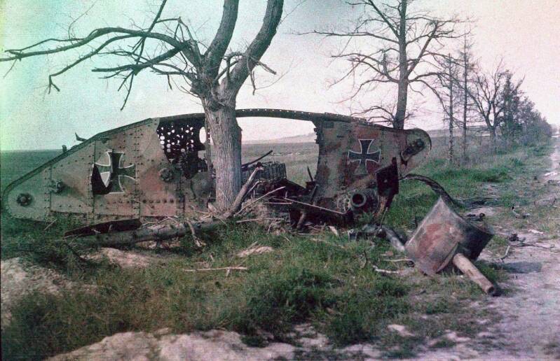 The wreck of a German tank, which was destroyed during a battle on the Western Front. By September 1918, Germany was on the brink of defeat in the First World War. The Allies' Hundred Days Offensive had pushed German forces back on the Western Front. The Hindenburg Line, Germany’s main defensive position, was crumbling under relentless attacks. Morale among soldiers and civilians was collapsing due to food shortages and economic strain. The German High Command, realizing the war was lost, sought an armistice, while unrest at home foreshadowed the revolution that would soon end the monarchy.