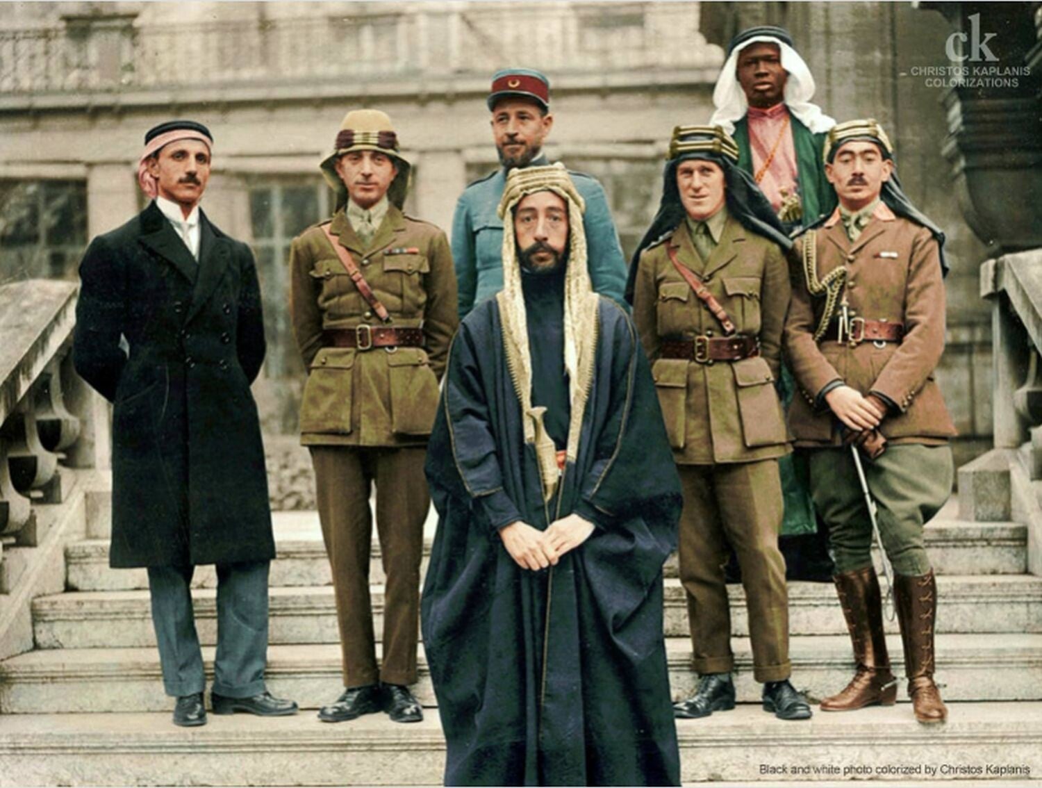 At the Peace Conference in Paris, 22nd January 1919. The Emir Faisal (1885 - 1933) king of the Helaz, who became King Faisal I of Iraq (centre) with (left to right) General Nuri Es-Sa'id (1888 - 1958); Anglo-Irish soldier and Arabist Thomas Edward Shaw (Lawrence of Arabia, 1888 - 1935); and Captain Pisani of the French Mission.