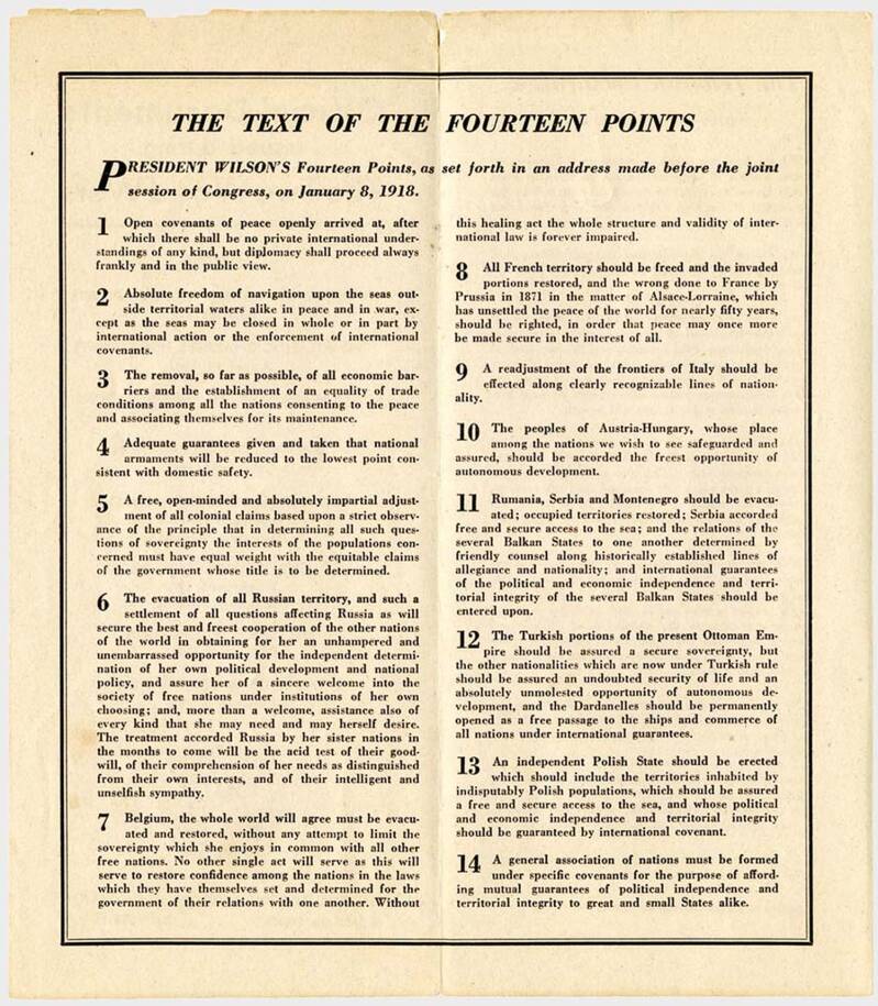 Transcript of President Woodrow Wilson's words from the 3rd Plenary Session of the Paris Peace Conference on the 14th February 1919.