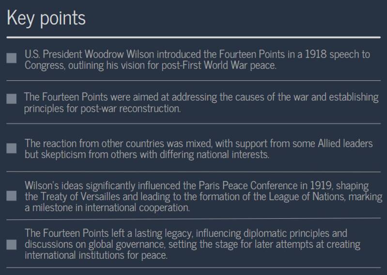 The Fourteen Points were a set of guiding ideals for peace that were to be utilised in talks to put an end to the First World War. President Woodrow Wilson presented the ideas in his address to the US Congress on January 8, 1918, which focused on the objectives of the war and the terms of the peace.