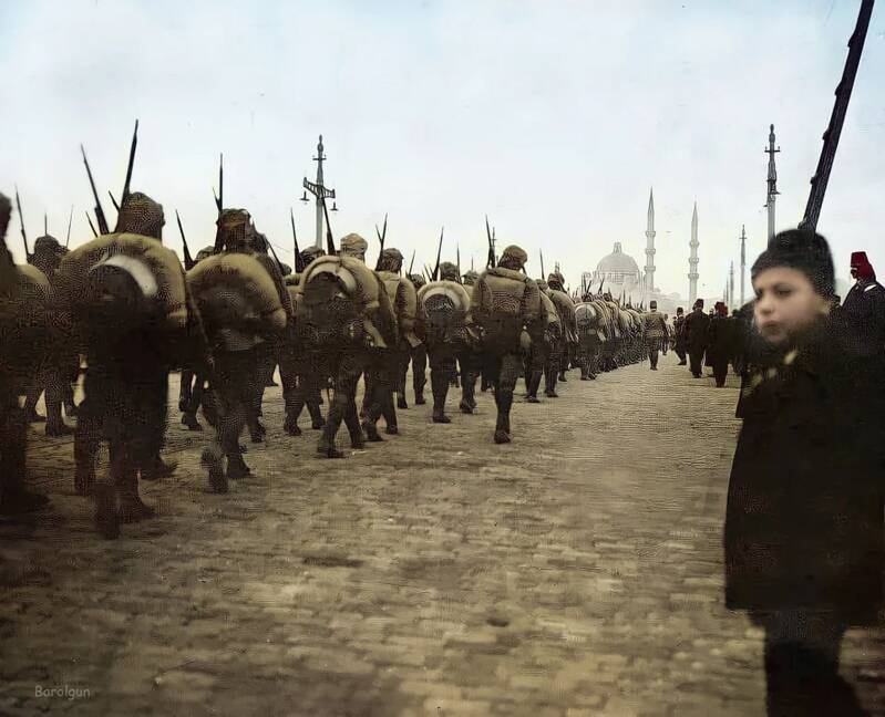 A young boy watches Ottoman soldier march to war in 1914. Six years later, the defeated Ottoman Empire would find itself at the mercy of the victorious Allied powers.