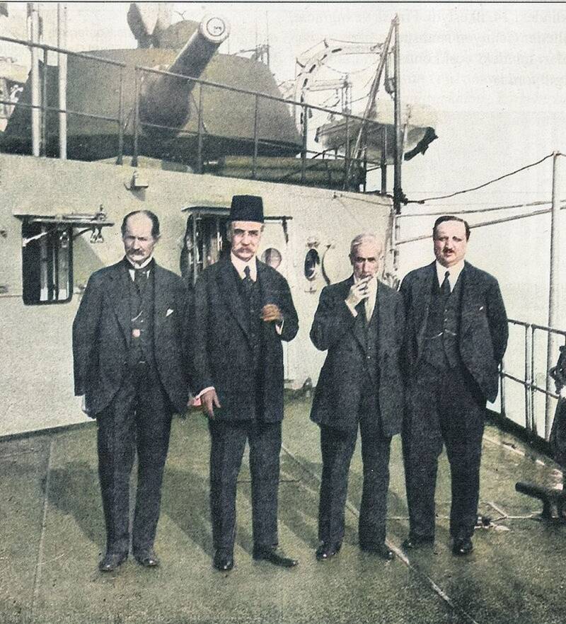 The Ottoman delegation at Sèvres comprising the three signatories of the treaty. Left to right: Rıza Tevfik Bölükbaşı, Grand Vizier Damat Ferid Pasha, the Ottoman education minister Mehmed Hâdî Pasha and ambassador Reşat Halis.