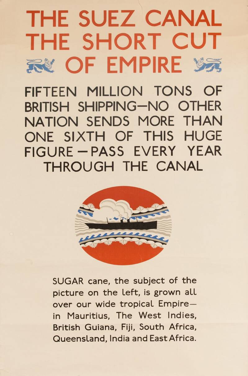 The Suez Canal, "The Short Cut of the Empire," Empire Marketing Baord Poster. The Empire Marketing Board was formed in May 1926 by the Colonial Secretary Leo Amery to promote intra-Empire trade and to persuade consumers to 'Buy Empire'. Control of the Suez Canal gave the United Kingdom a huge amount of influence over trade.