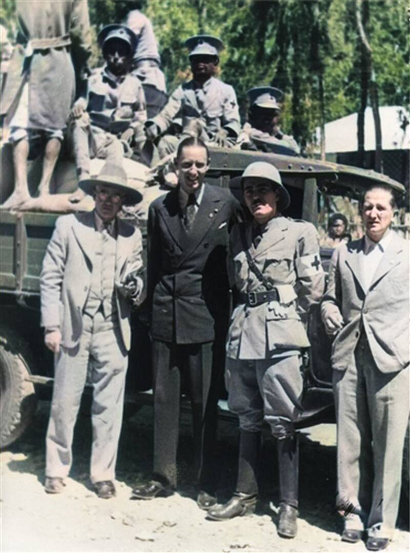 Haile Selassie, accompanied by his son, visits an Ethiopian Red Cross Society field hospital following the air raid.