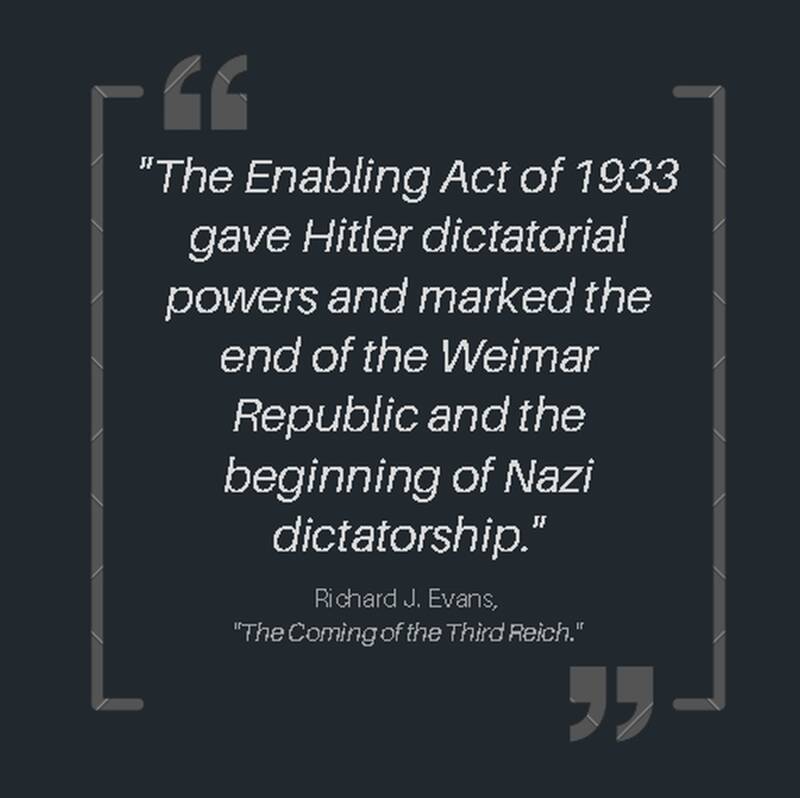 In conclusion, the Enabling Act of 1933 was a critical moment in the establishment of the Nazi dictatorship in Germany. The act gave Hitler and his government sweeping powers to pass laws and govern without any constraints, and it paved the way for the implementation of many of the policies that defined the Nazi regime.
