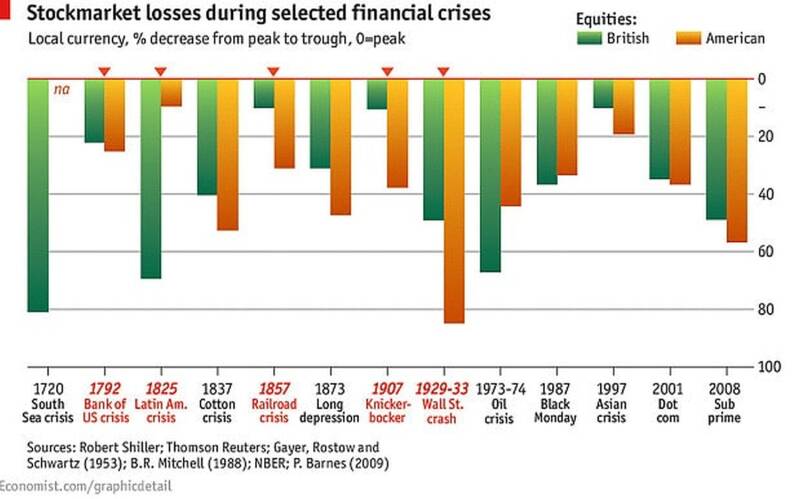 Comparison of stock market losses throughout various financial crisis. The Wall Street Crash was the most serious for the USA by a sizable amount.
