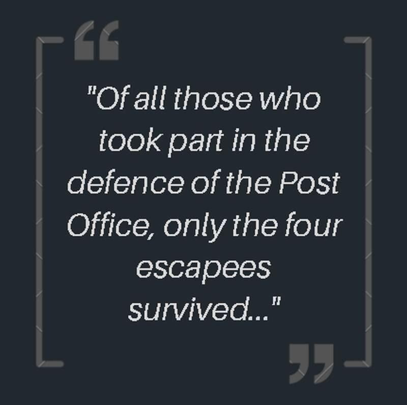 Of all those who took part in the defence of the Post Office, only the four escapees survived, having avoided capture, and sharing the same fate as their colleagues.
