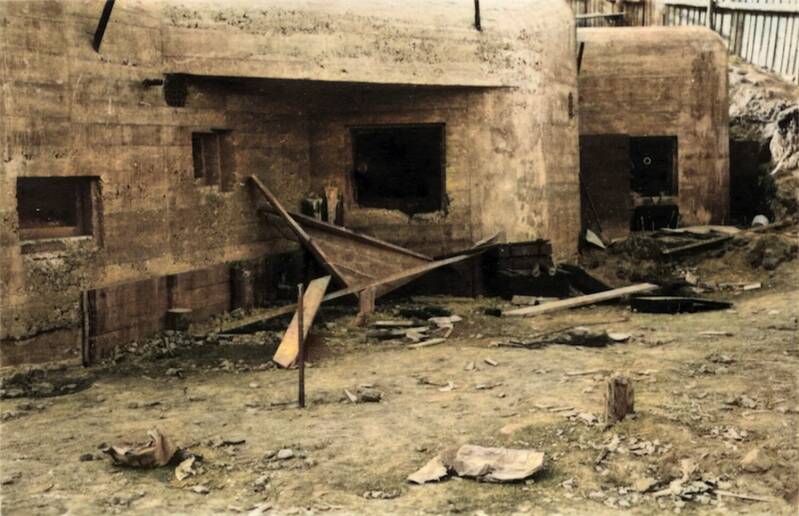 German soldiers standing next to the entrance. of a captured bunker. Damage from the battle can clearly be seen.