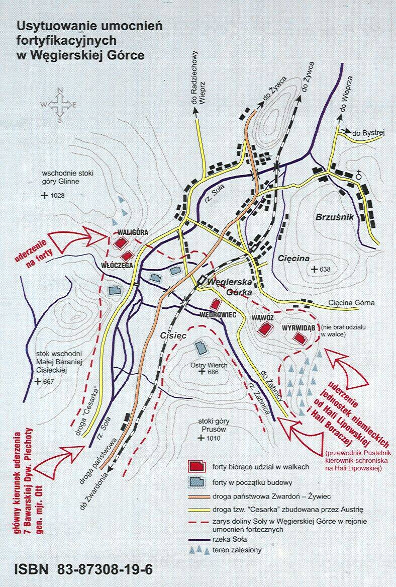 - The Koszarawa River area would be defended by bunkers at Korbielów, Krzyżowa and Przyborów.