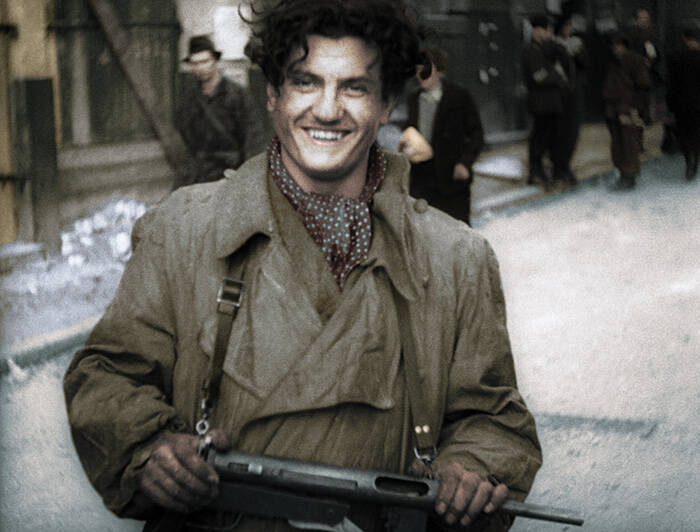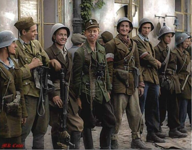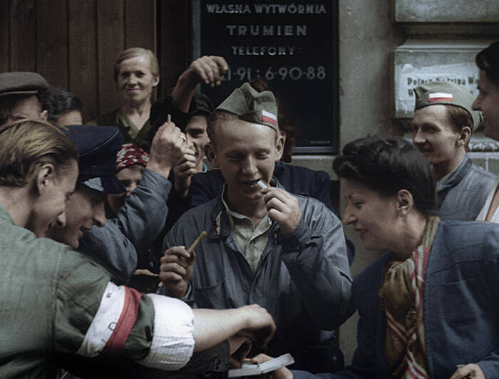 Jubilant insurgents overcome by joy after they capture a German stronghold in the Police Headquarters complex and the Holy Cross Church on 23 August 1944