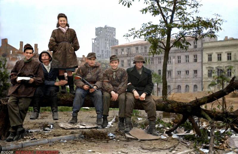 21-year-old Polish fighter Zbigniew Knotowski, wearing a captured German helmet, who was killed during the Uprising.