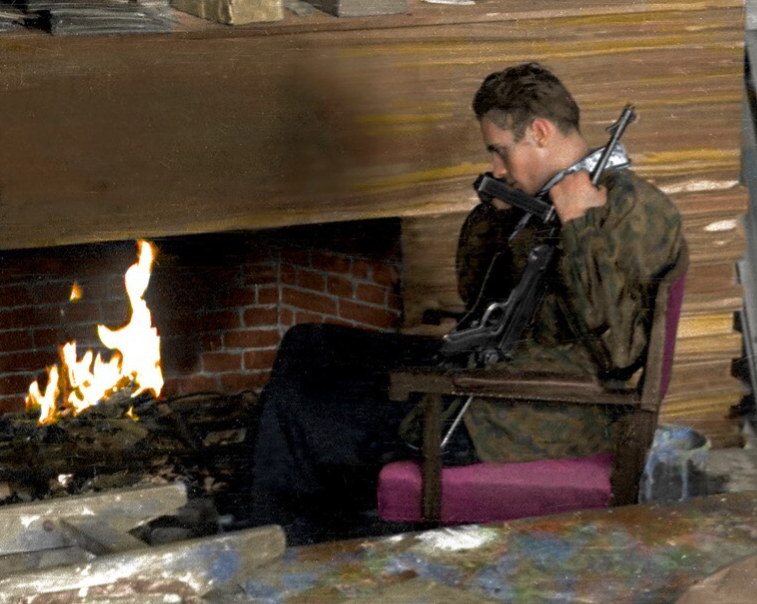 Insurgent Wiesław Chrzanowski with a captured MP-40 machine gun, resting in front of a fireplace, during a rare moment of peace.