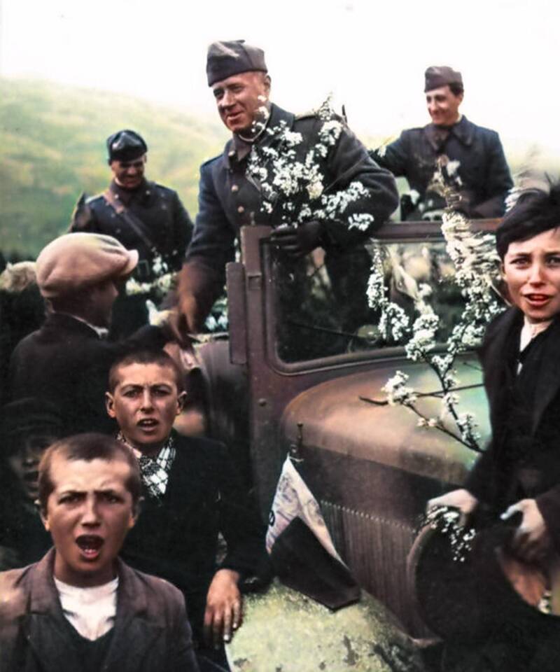 Bulgarian troops invading the so-called Western Outlands in Eastern Serbia 19 April 1941. During WWII, Bulgaria, as part of the Axis, occupied Vardar Banovina in Yugoslavia, facilitated German troop movements, and fought against local nationalist resistance groups.