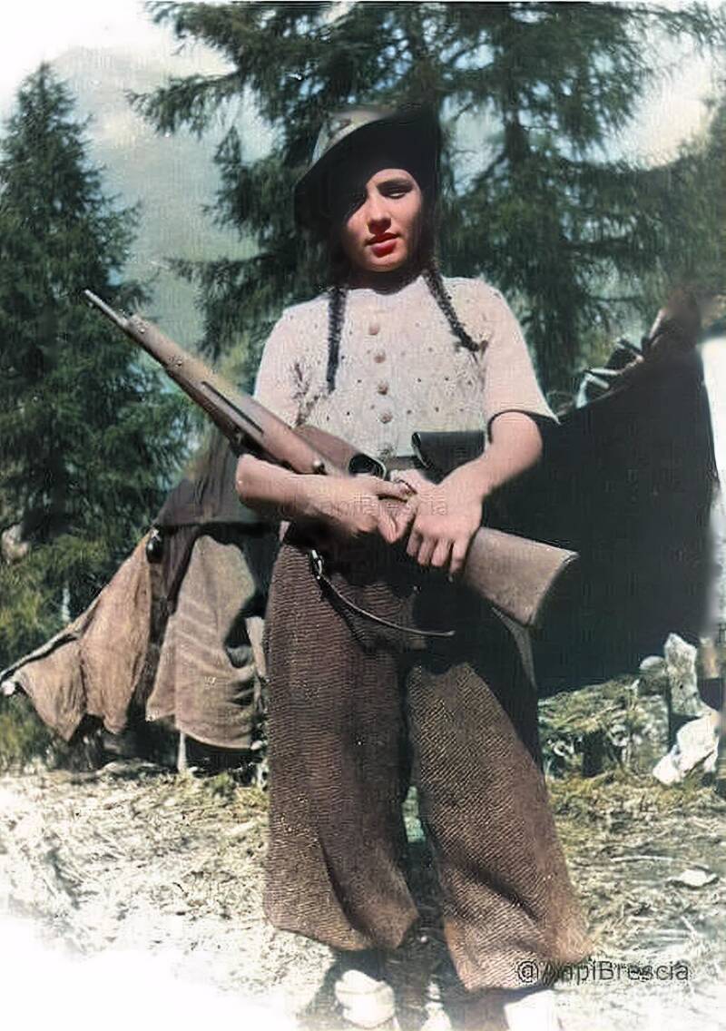 Italian partisan Rosy Remelli in Val Camonica, Lombardy, Italy in 1944. At just 14 she was the youngest Italian partisan of the war. Italian partisans played a crucial role in resisting Axis occupation, conducting guerrilla warfare, sabotage, and intelligence gathering. Their actions disrupted enemy operations and contributed significantly to the Allied war effort.