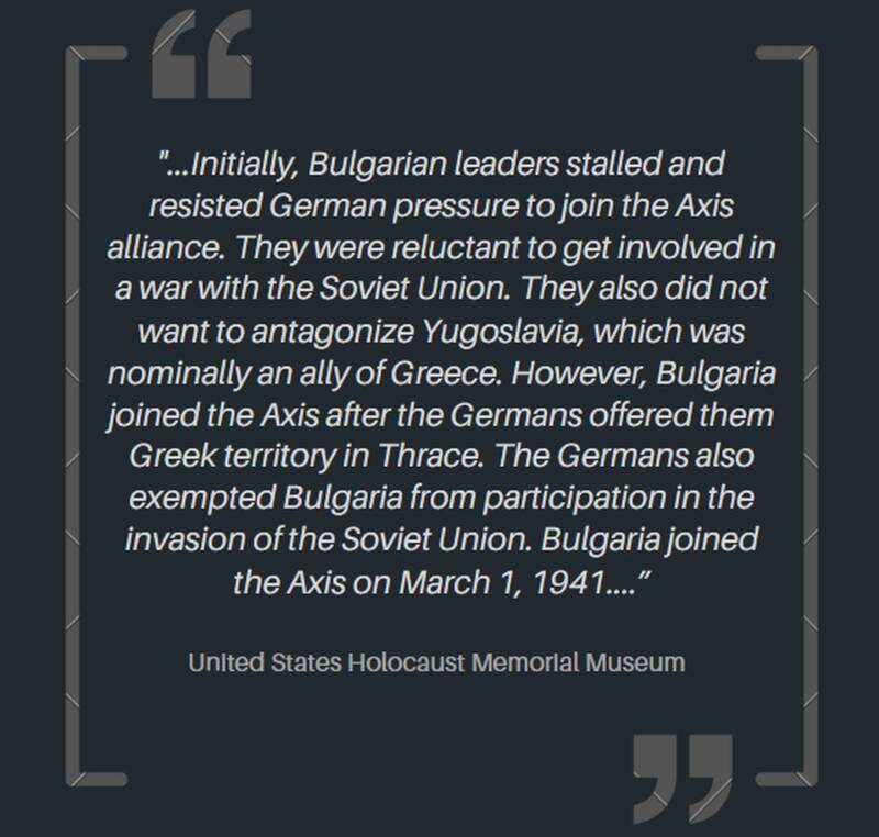 Bulgaria supported the Axis invasion of Yugoslavia and Greece by allowing German troops to use its territory for their attacks.