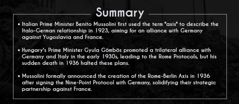 The first significant step was the protocol signed by Germany and Italy in October 1936, after which Italian leader Benito Mussolini declared that European countries would revolve around the Rome–Berlin axis, coining the term "Axis."