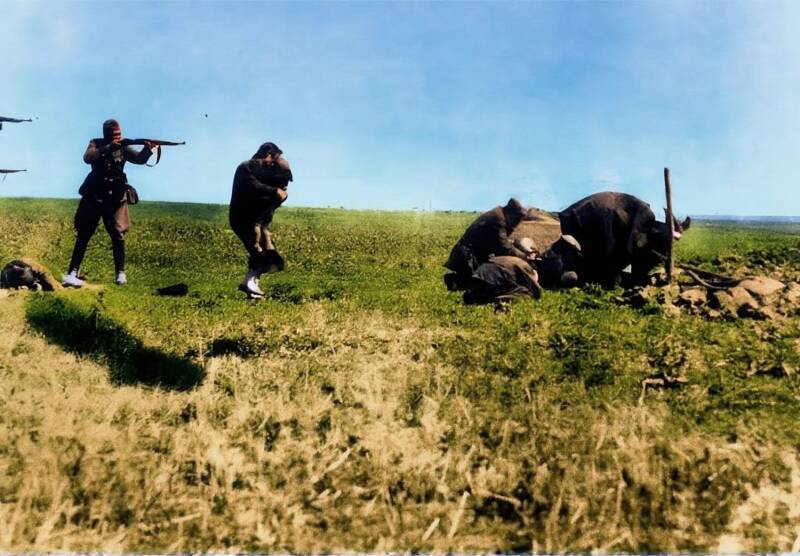 Soviet POWs covering a mass grave after the Babi Yar massacre. The massacre, carried out on 29–30 September 1941, was one of the largest single mass shootings of the Holocaust. Following the German occupation of Kiev in Ukraine, the city’s Jews were ordered to assemble near the cemetery, ostensibly for resettlement. Instead, they were taken to the Babi Yar ravine, forced to undress, and shot in successive groups by units of Einsatzgruppe C, assisted by police battalions and local auxiliaries. 33,771 Jews were murdered in two days, with further killings of Roma, Soviet prisoners, and civilians continuing at the site throughout the occupation.