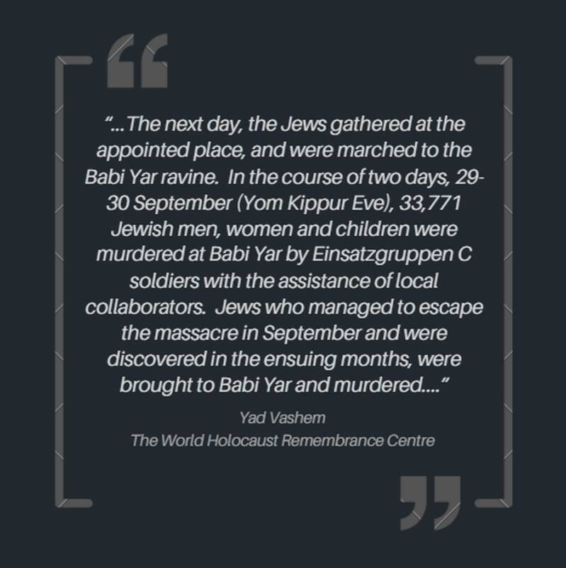 The most infamous atrocity was the Babi Yar massacre outside Kiev, where 33,771 Jews were murdered on 29–30 September 1941.
