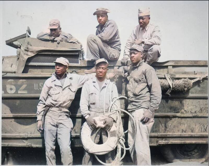 Marines T/5 L. C. Carter, Jr., Private John Bonner, Jr., Staff Sergeant Charles R. Johnson, T/5 A. B. Randle, T/5 Homer H. Gaines, and Private Willie Tellie pose for a photo on Iwo Jima. They are credited with saving a fellow Marine who was drowning. 11 March 1945.