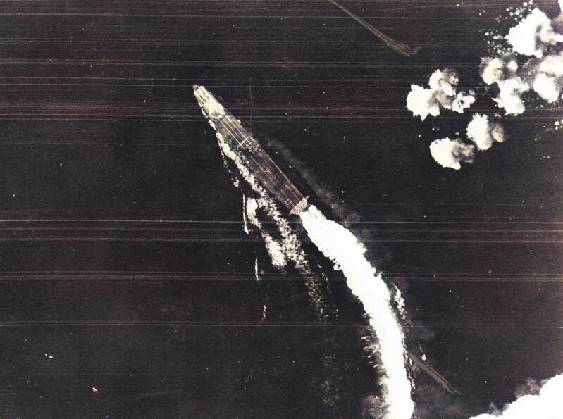The Japanese aircraft carrier Hiryu maneuvers to avoid bombs dropped by USAAF Boeing B-17E Flying Fortress bombers during the Battle of Midway on 4 June 1942.