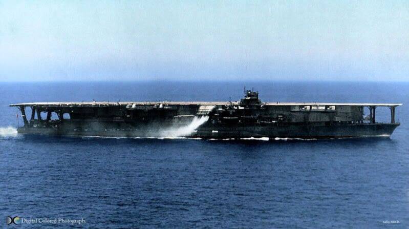 USS Yorktown Yorktown at the moment of impact of a torpedo from a Nakajima B5N of Lieutenant Hashimoto's 2nd chūtai